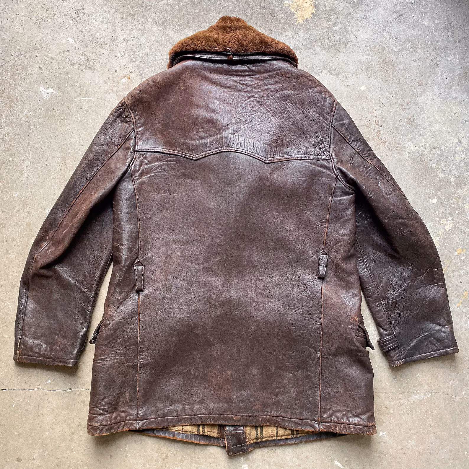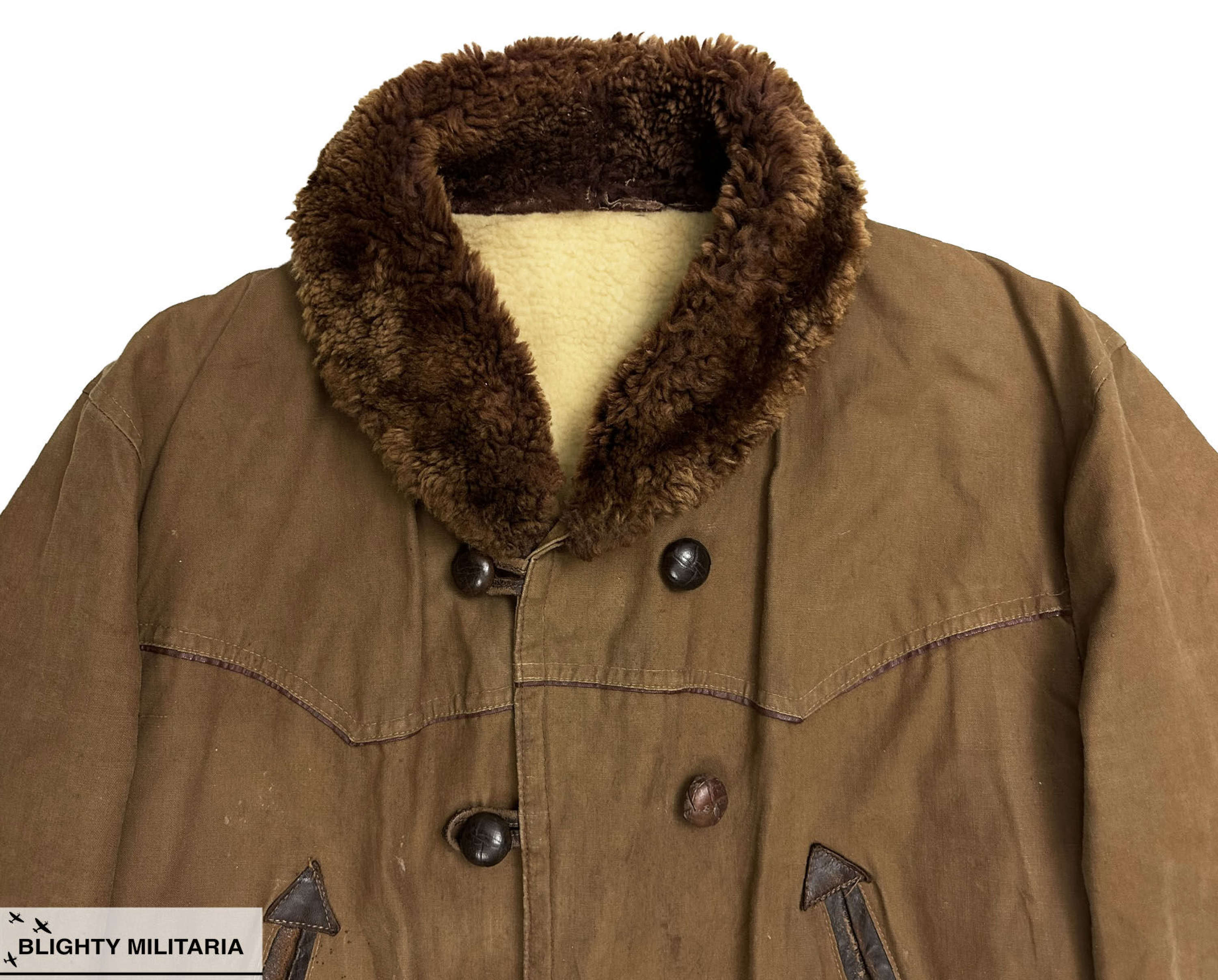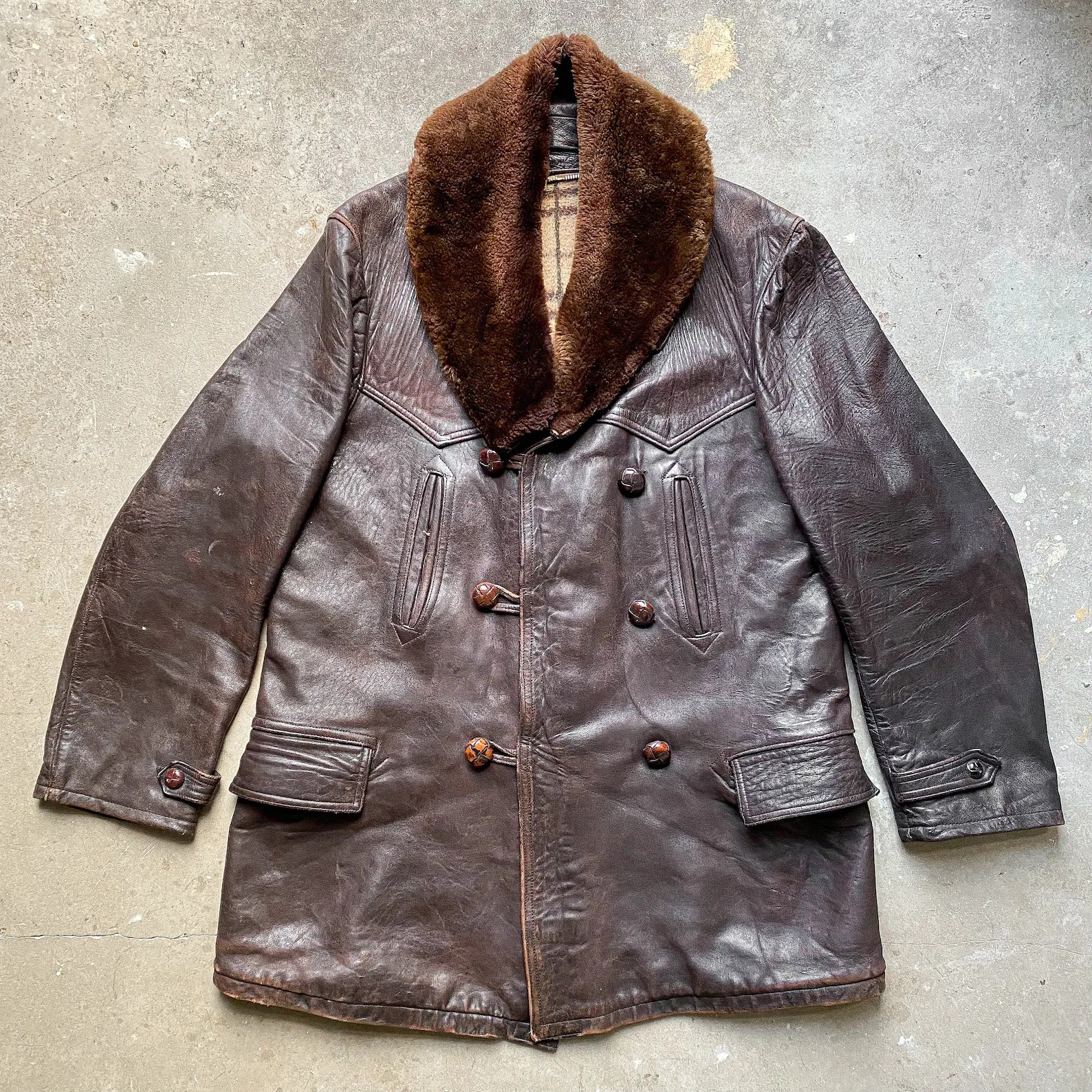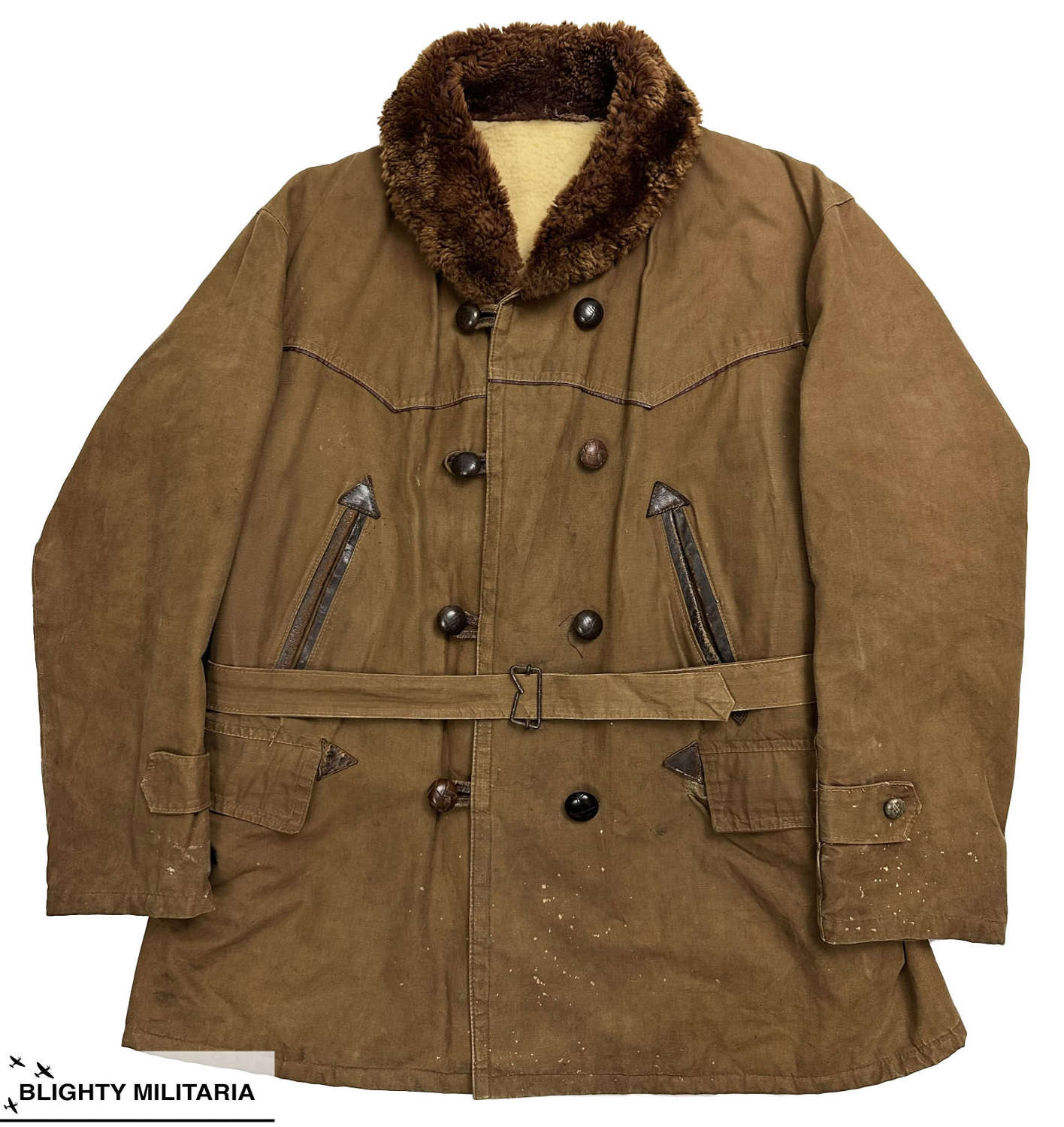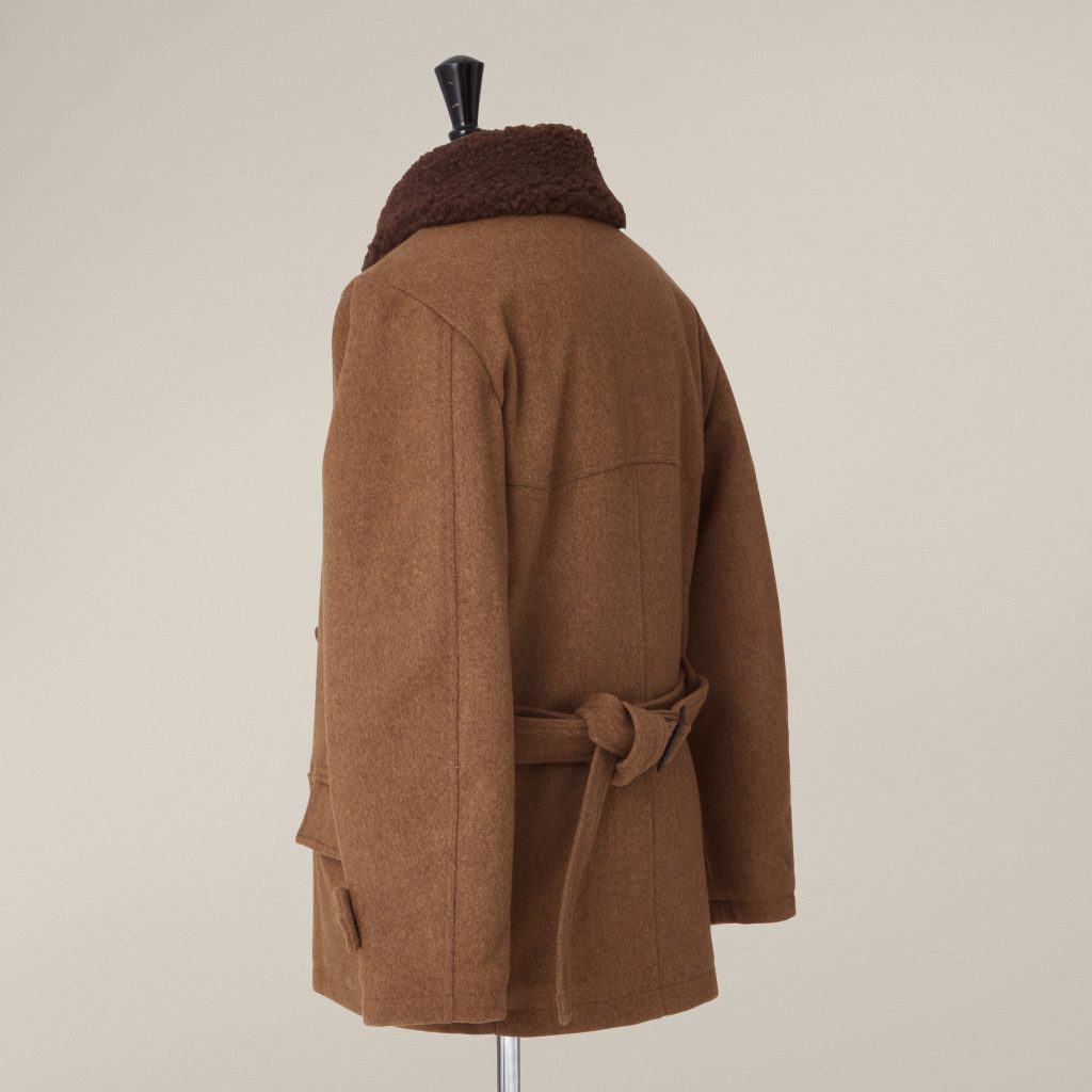 (Above) Original 1940s French ‘Canadienne’ / Barnstormer Mackinaw Jacket This style of jacket was popular in France during the mid-Century period and are a classic item today. This double breasted designed with sheepskin collar is often referred to as ‘Barnstormer’ which was a style of jacket which became popular during the inter-war period with the rise of aviation and motor. pursuits. The design was also popular in France with cotton canvas coats such as this being widely produced. This material was chosen for its hard wearing and waterproof qualities which make it very suitable as an outdoor jacket. The double breasted front fastens with leather ‘football’ style buttons and the original waist belt is even still present and fastens with a metal wire buckle. Leather edged slash pockets are located to the front below which are flapped pockets. There is a yoke detail which passes over the shoulders and features a leather trim which is a nice detail. The interior of the jacket features a sheepskin lining to the upper section and a quilted section to the skirt. There are no interior pockets.