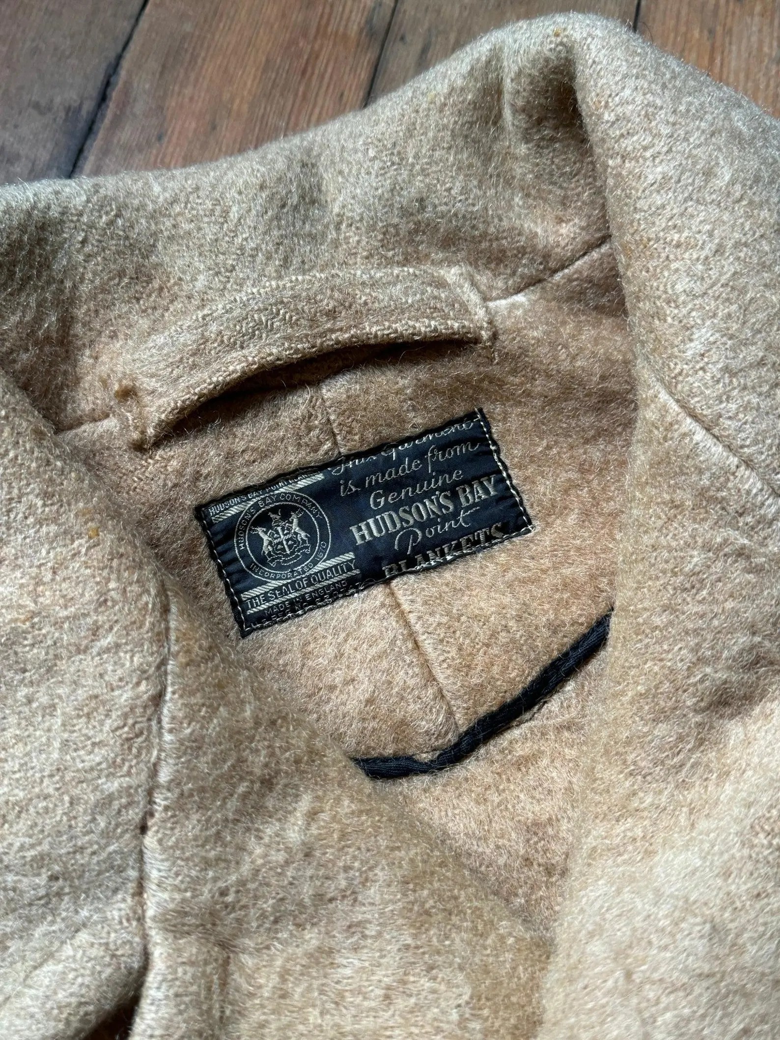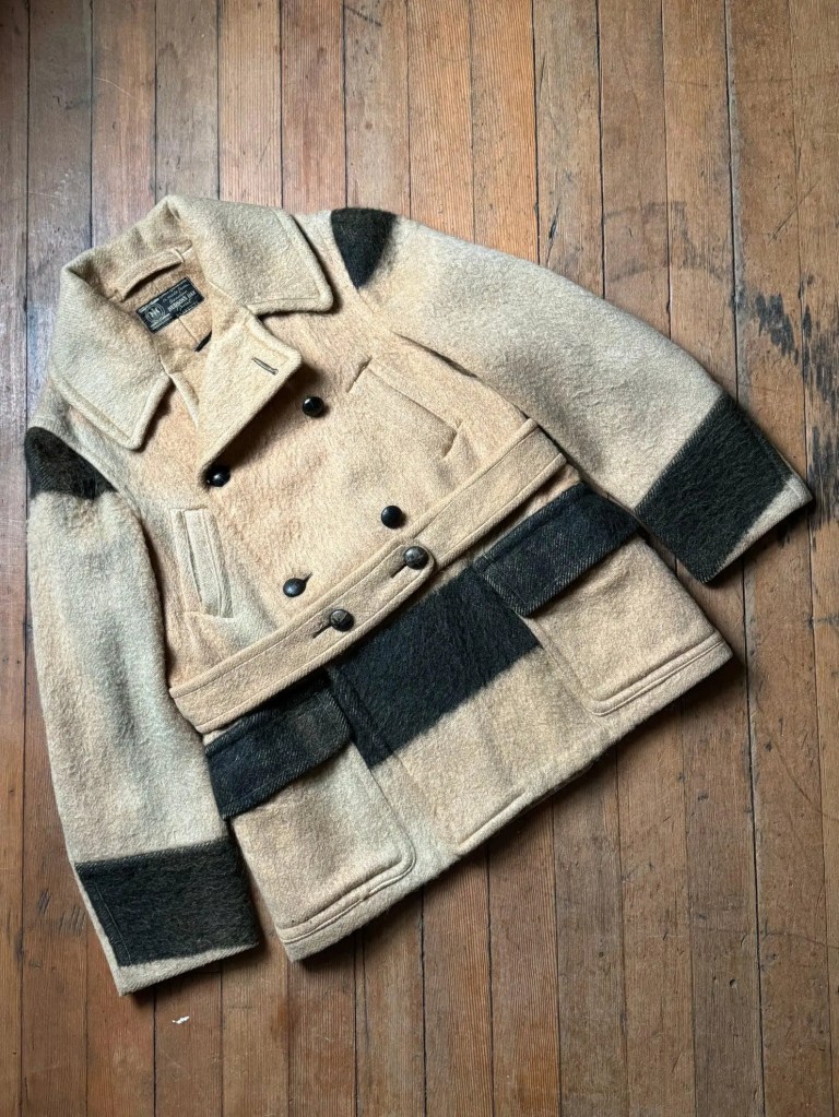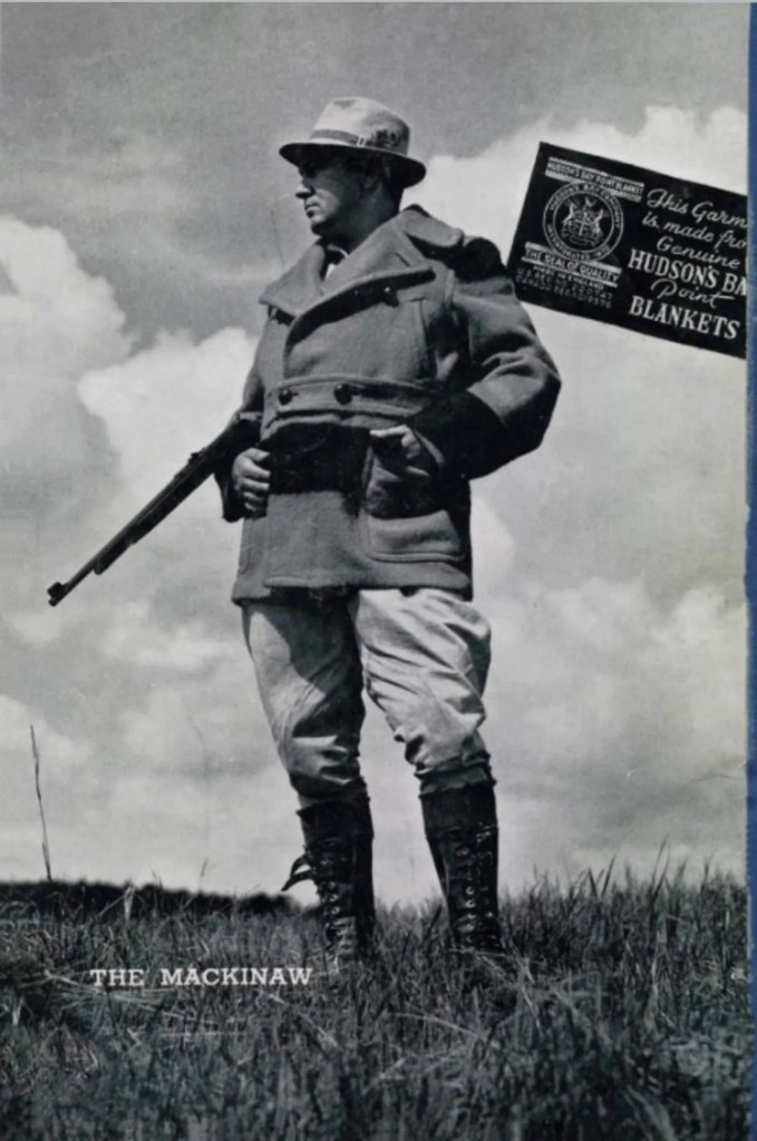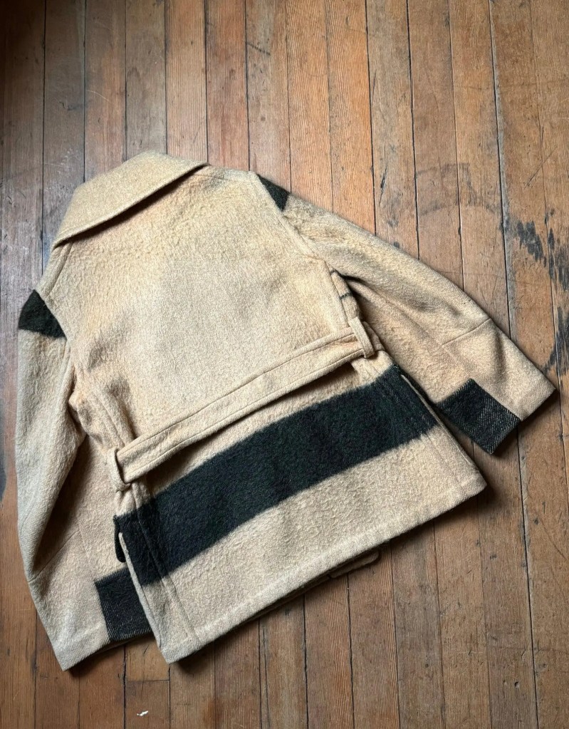 Really special point blanket coat by none other than the Hudsons Bay Company. this one is likely from the 1930s but I was able to find one ad from 1922 where the women’s version has the hand warmer pockets though you can’t tell if the men’s version does. I then found a lot of versions of this coat from the early 1930s without the hand warmer pockets and then advertisements for this exact coat with the hand warmer pockets in 1937-1938. So I’m not leaning towards this piece being 1930s though I believe this model existed in the 1920s as well. FoxVintageMercantile
