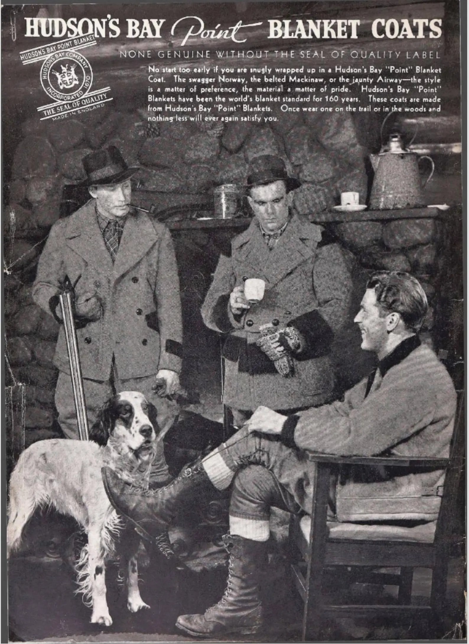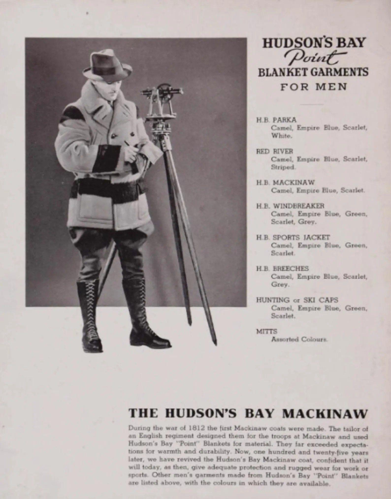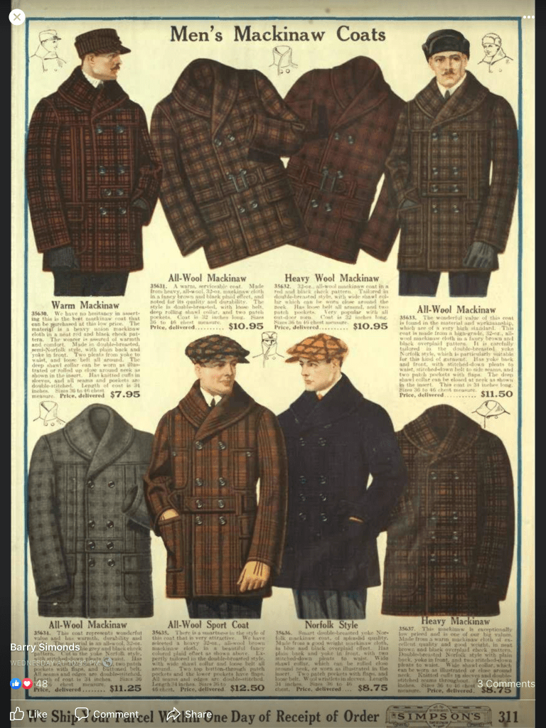 Really special point blanket coat by none other than the Hudsons Bay Company. this one is likely from the 1930s but I was able to find one ad from 1922 where the women’s version has the hand warmer pockets though you can’t tell if the men’s version does. I then found a lot of versions of this coat from the early 1930s without the hand warmer pockets and then advertisements for this exact coat with the hand warmer pockets in 1937-1938. So I’m not leaning towards this piece being 1930s though I believe this model existed in the 1920s as well. FoxVintageMercantile