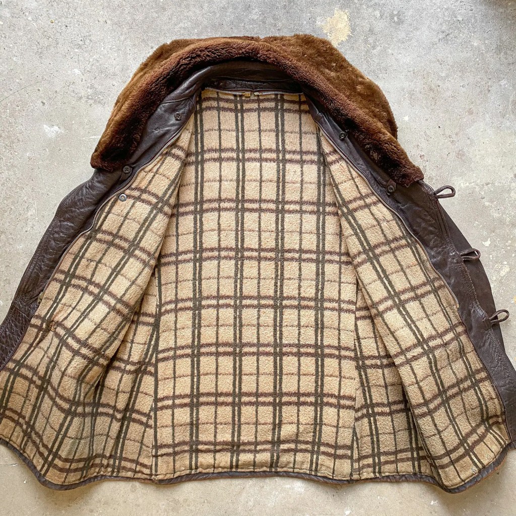 (Above) Vintage 50’s Barnstormer coat. It was made in France in the 1950’s. Designed for harsh winters this jacket was traditionally called a ‘Canadienne’ and features a wool blanket lining and detachable sheepskin collar. Not only is it very comfortable and warm, its design is also rugged and timeless which makes it the perfect winter coat! Roots Revived Relics