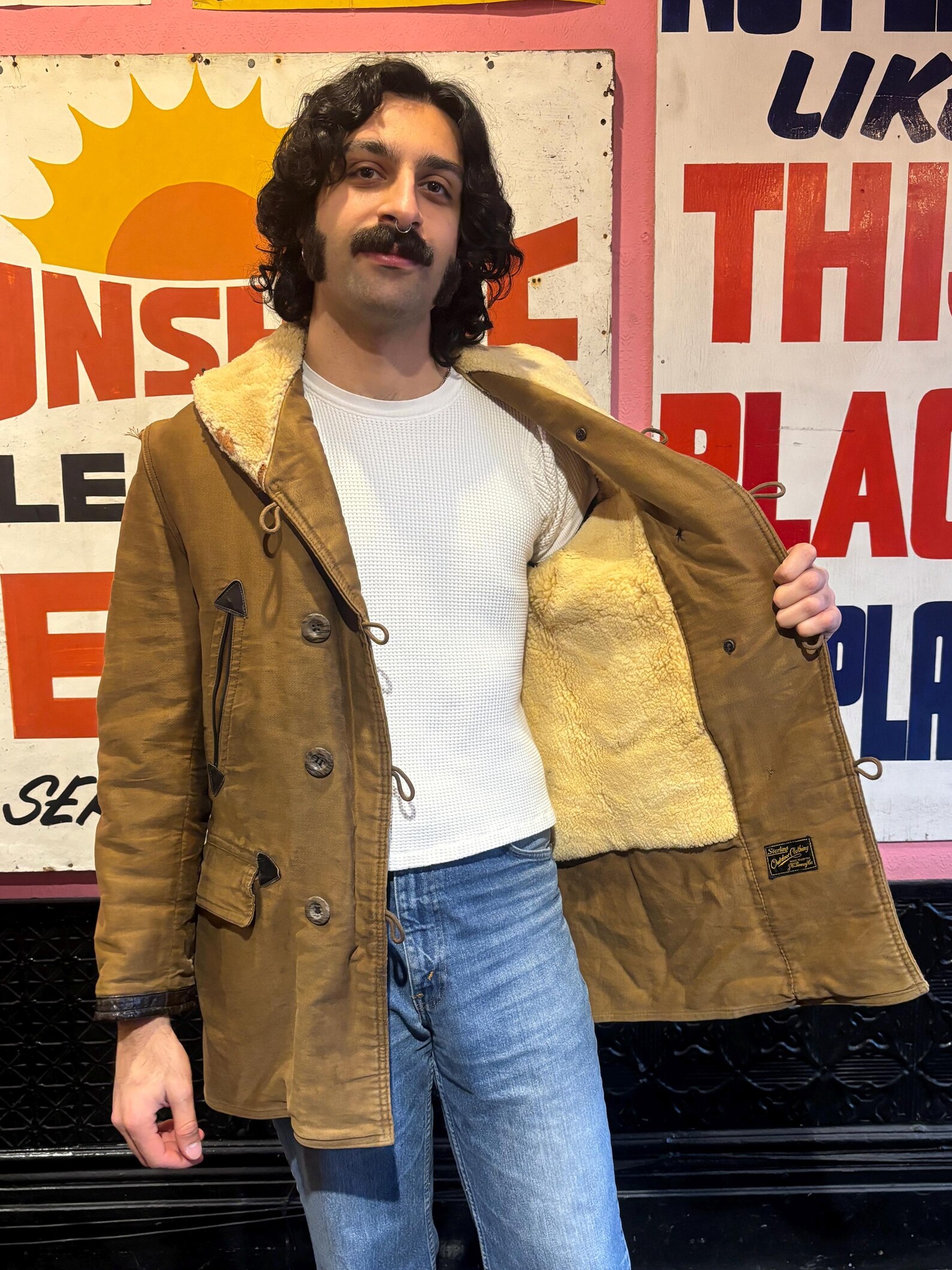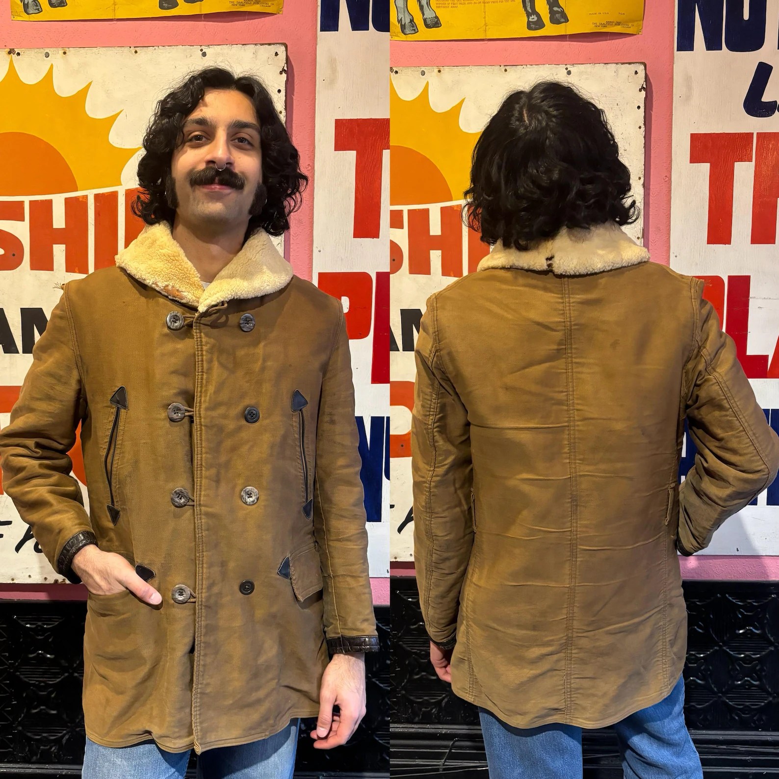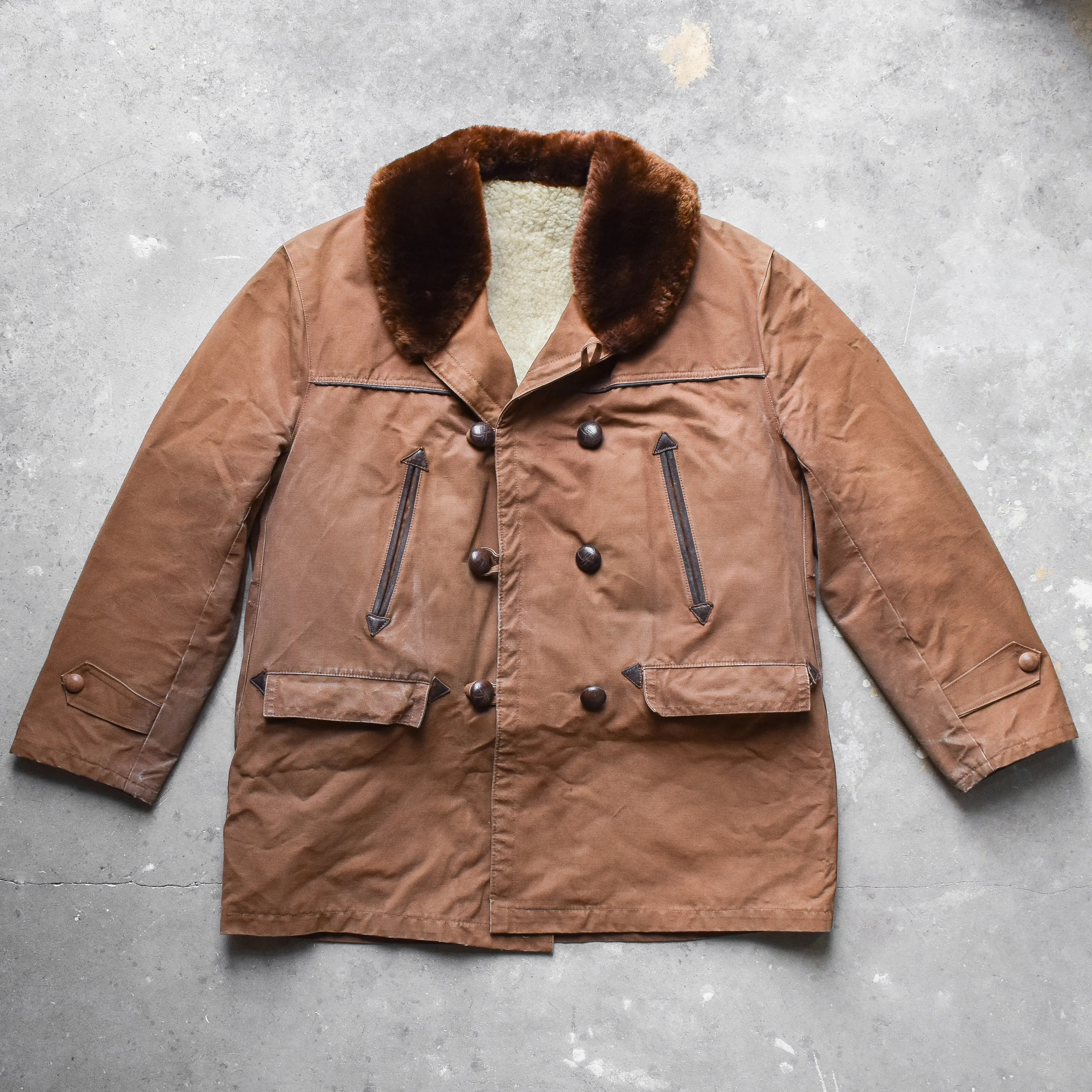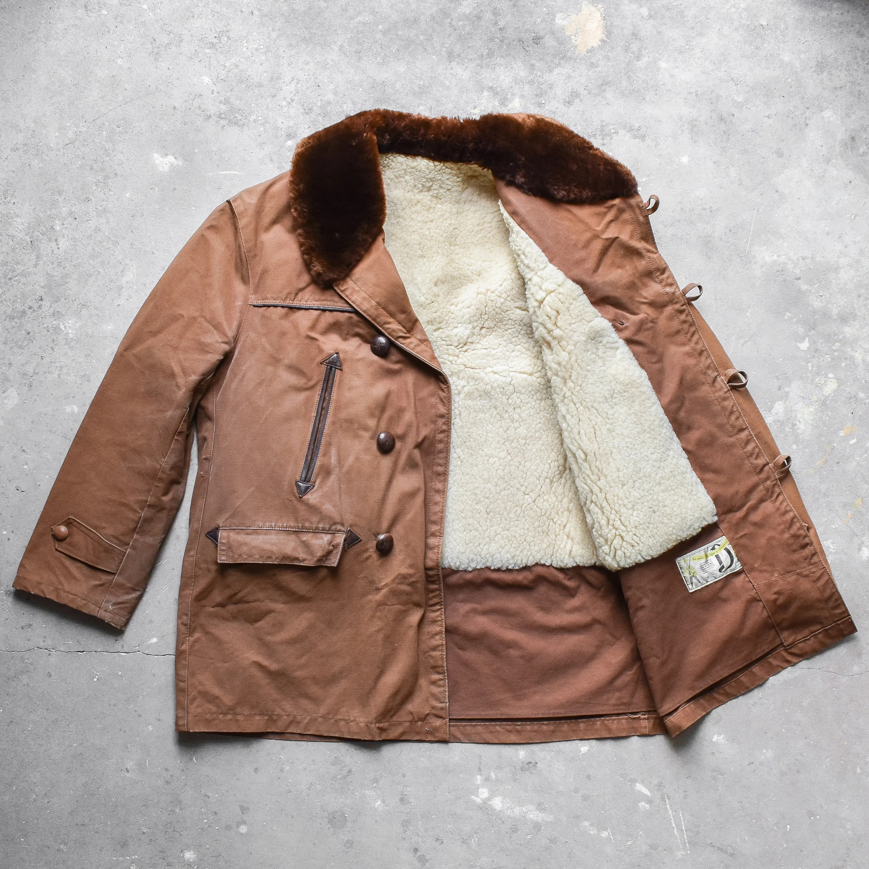 (Above)Vintage 50’s French Canadienne coat. It was made by the French clothing manufacturer of Dickson. The classic design of the Canadienne is timeless and perfect for winter temperatures! It’s sheepskin lined, making it very comfortable and warm! The outer layer is made of rugged brown canvas. Roots Revived Relics